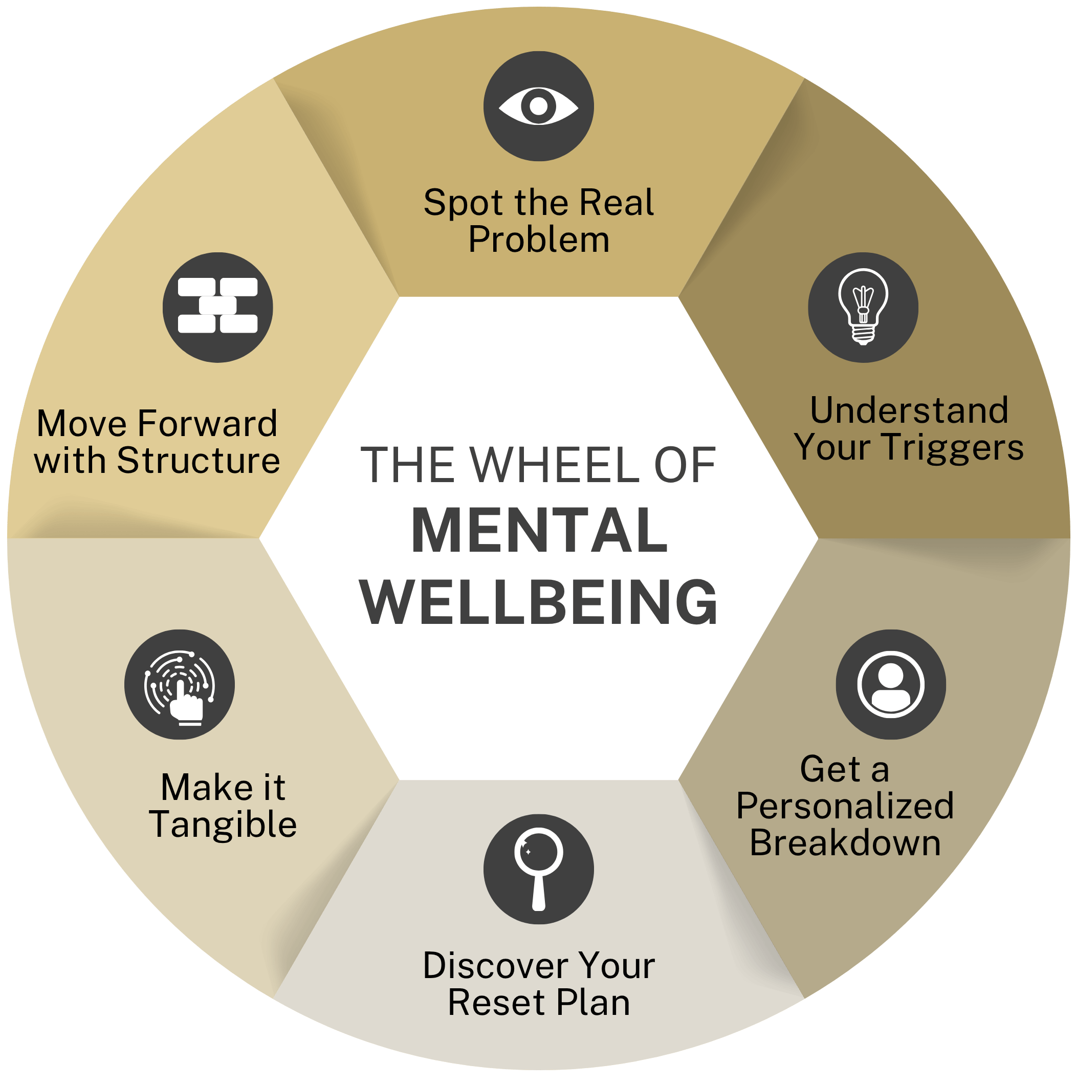 It helps you spot the real problem, the first and most important step in resetting your mental wellbeing. From there, the Wheel of Mental Wellbeing shows the full journey: